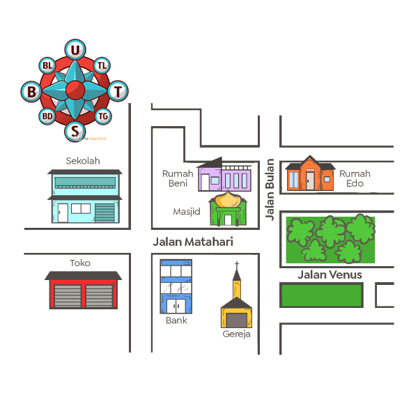 Petunjuk Arah Mata Angin. Tuliskan arah perjalanan Beni dari rumahnya menuju rumah Bu Dina. Dengan denah akan mempermudah kita untuk menemukan berbagai macam tempat-tempat tertentu tanpa harus bertanya pada orang lain.
